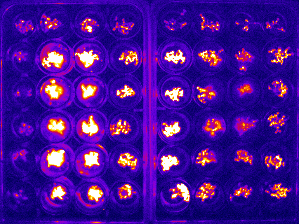 细菌生物发光在细菌细胞间通讯(称为群体感应)中起着关键作用。众所周知,群体感应允许在改变种群密度和响应环境条件期间改变基因表达。它在生物膜形成和毒力方面也很重要。细菌发光也可用于作为荧光素酶报告基因表达、细胞活力测定或作为生物传感器的基础进行灵敏测量。细菌发光甚至比其他形式更弱,这意味着成像检测器必须在几分钟的曝光持续时间内具有最小的噪声。iKon 深度冷却 CCD 相机因此非常适合这些研究,其同类优秀的低噪声性能允许检测表达的细微变化。